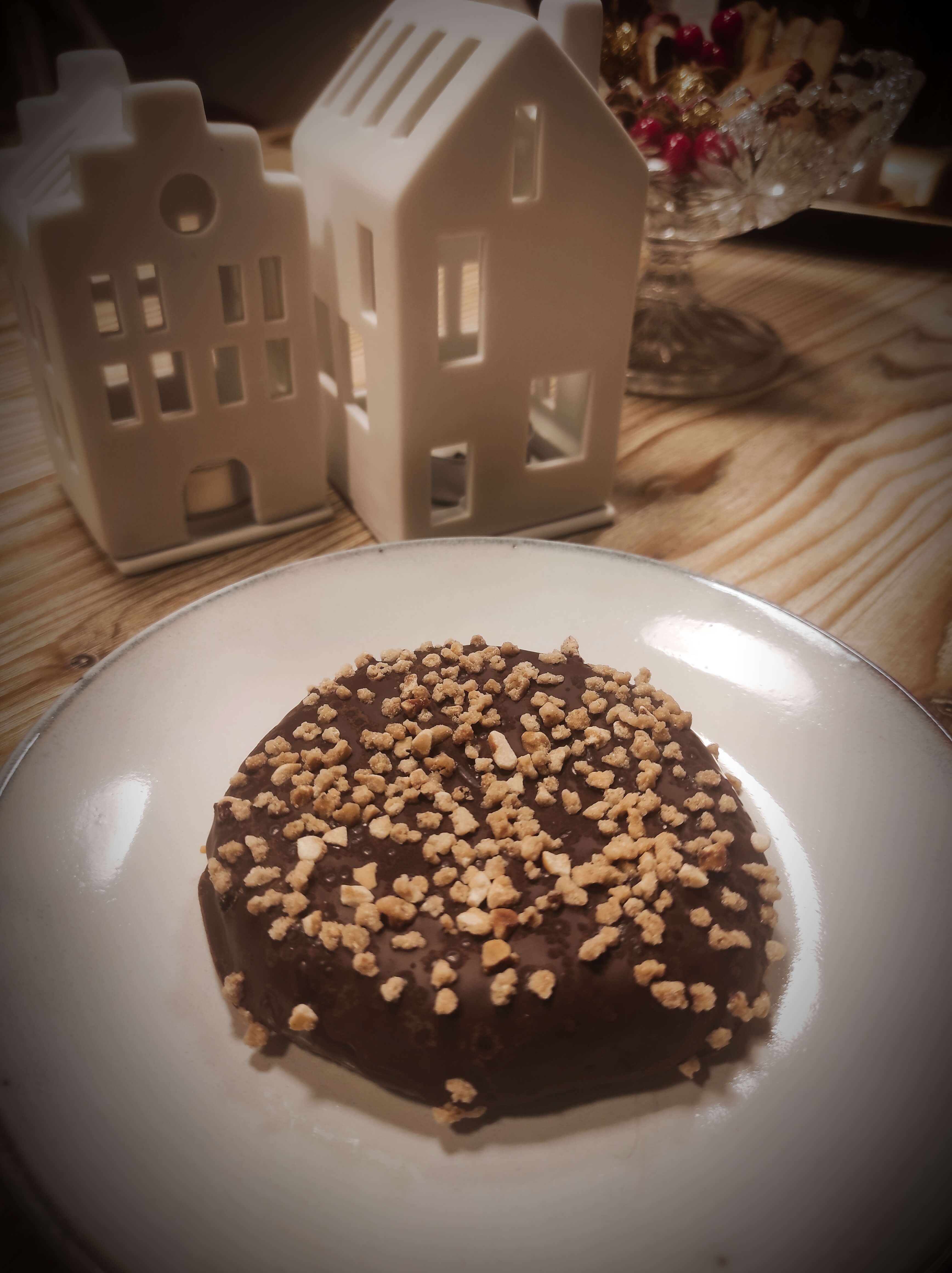 Mit Zartbitterschokolade glasiert und Haselnusskrokant.