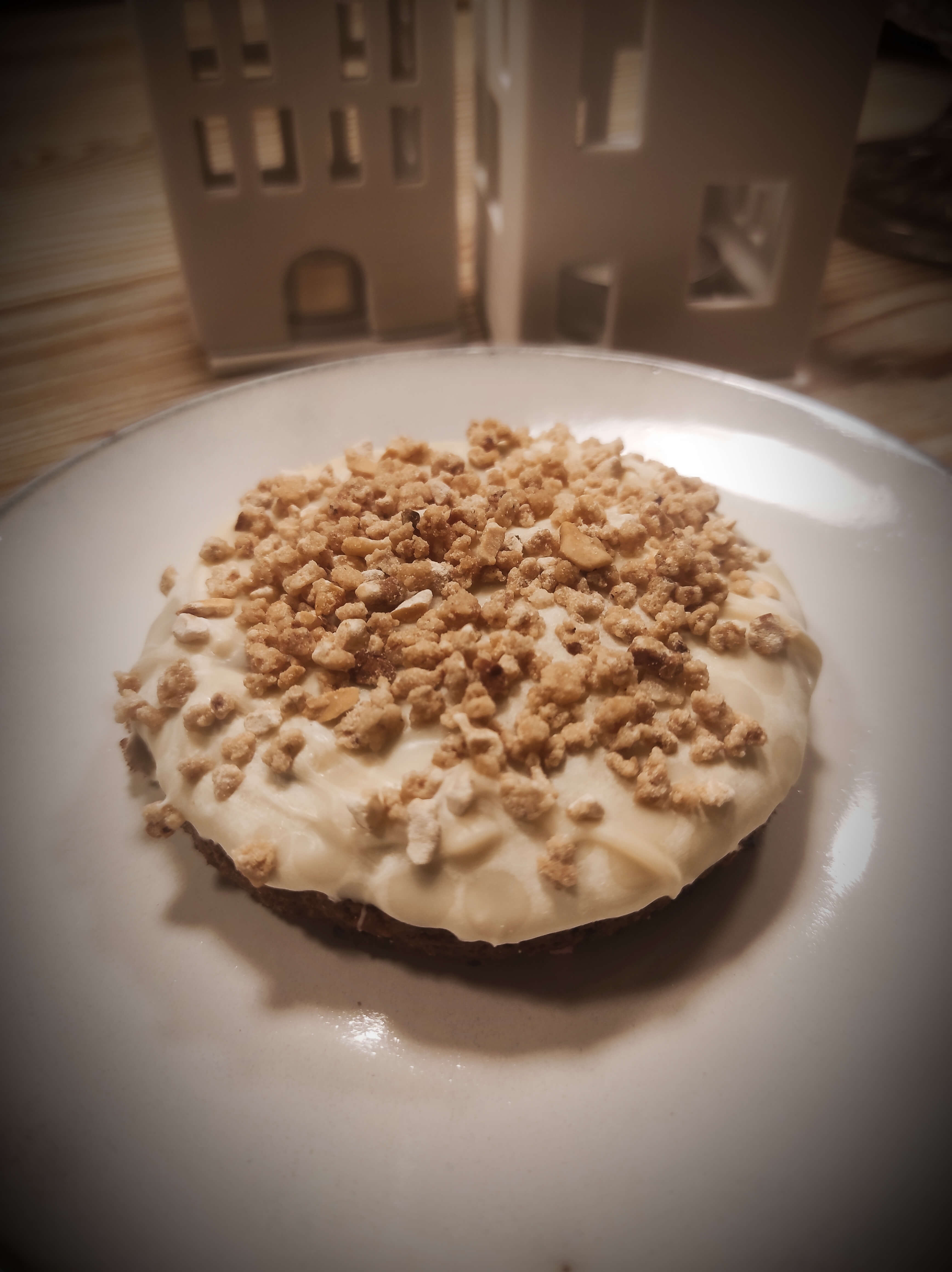 Mit weißer Schokolade glasiert und Haselnusskrokant.